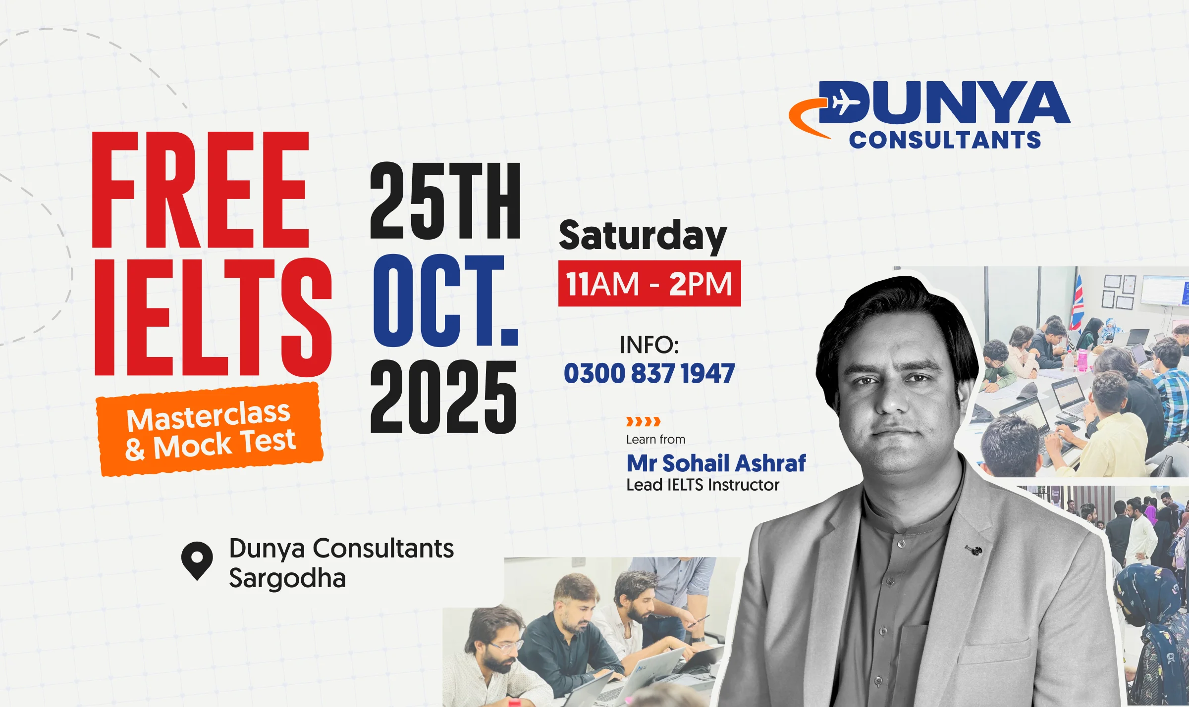 The session will be led by Mr. Sohail Ashraf, Lead IELTS Instructor at Dunya Consultants. Students will receive practical insights, score-improving strategies, and section-wise guidance for all four IELTS components: