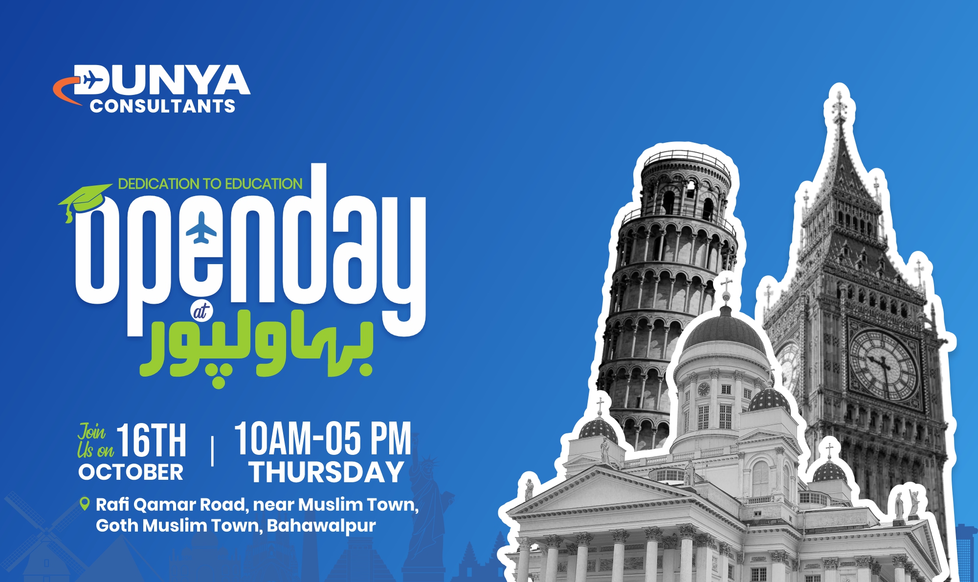 Dunya Consultants is pleased to invite students from colleges, academies, and universities across the region to a special Study Abroad Open Day Bahawalpur. This event is designed for students who want trusted guidance on international admissions, scholarships, student visas, and long-term study abroad planning.